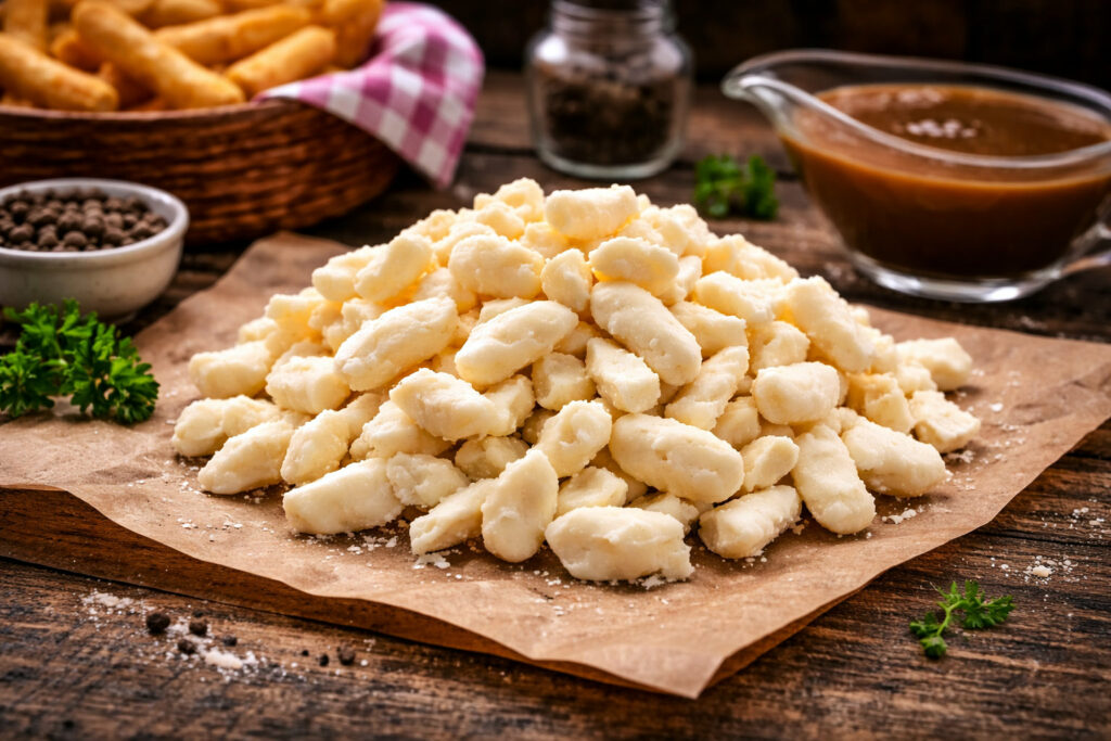 Le fromage en grains, aussi appelé « cheese curds », est l’ingrédient indispensable de la poutine québécoise. Il s’agit d’un fromage frais non affiné, issu du caillé de lait de vache, consommé quelques heures seulement après sa fabrication. Reconnaissable à sa texture élastique et à son fameux « squick-squick » sous la dent, il appartient à la famille des fromages frais. Son goût est doux, légèrement lacté et salé. Véritable symbole culinaire du Québec, le fromage en grains est aujourd’hui recherché pour son authenticité et son usage incontournable dans la poutine traditionnelle.