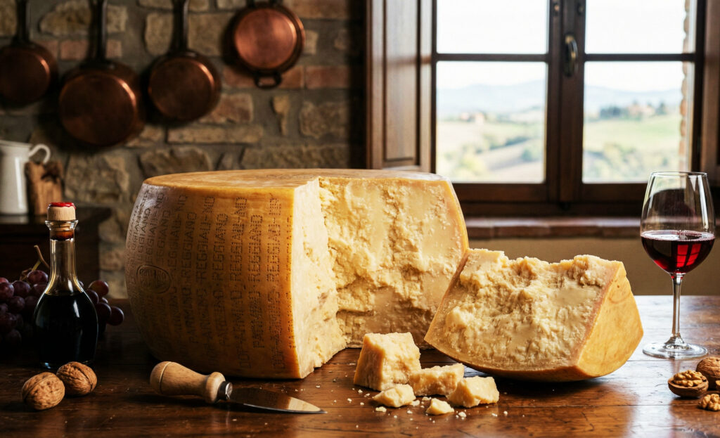 Le Parmigiano Reggiano est né au Moyen Âge, dans les monastères bénédictins et cisterciens d’Émilie-Romagne. Les moines cherchaient un fromage capable de se conserver longtemps tout en valorisant le lait local. Grâce à un affinage prolongé et à une fabrication rigoureuse, le Parmigiano Reggiano est devenu une référence mondiale. Son appellation protégée garantit aujourd’hui un respect strict des méthodes traditionnelles et du terroir.