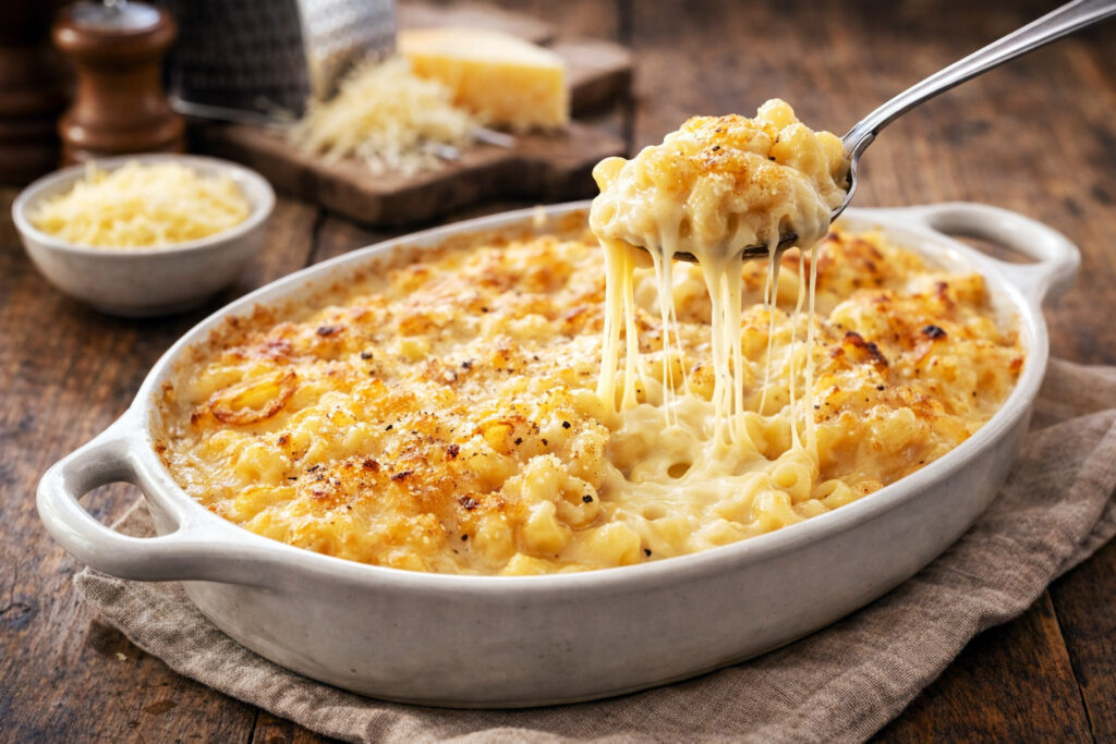 Les macaroni au fromage maison sont l’une des grandes recettes réconfortantes de la cuisine familiale. Inspirée du célèbre mac and cheese anglo-saxon mais profondément ancrée dans la tradition des gratins européens, cette version repose sur une base simple et savoureuse : des pâtes parfaitement cuites, une sauce onctueuse au fromage et un gratin doré au four.